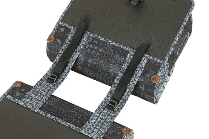 The Basil Bohème Double Bag is a stylish choice of bicycle bag. This double-sized bag comes in charcoal grey with an eye-catching bohemian print that’s bound to impress. Offering a total capacity of 35 litres, this one is big on space and ensures you’ll never have to compromise when it comes to deciding what to take with you on a bike ride, whether you’re heading out to the country to enjoy the great outdoors, or planning for the commute into the office. It’s also an ideal companion for trips to the market or grocery store, with plenty of storage space for food and purchases, meaning you don’t have to worry about carting endless plastic and paper bags around with you. The Basil Bohème Double Bag is made from water-repellent material to keep rain at bay should you encounter a shower, while the artificial leather details round things off beautifully and bring a slick, stylish finish. Wondering how this bag attaches to your bike? It’s all very simple. Thanks to the Universal Bridge system, you can easily attach the bag to your luggage carrier, as well to the luggage carrier of your electric bike. The Universal Bridge system consists of four slots. These slots make it possible to attach the bag in two ways: