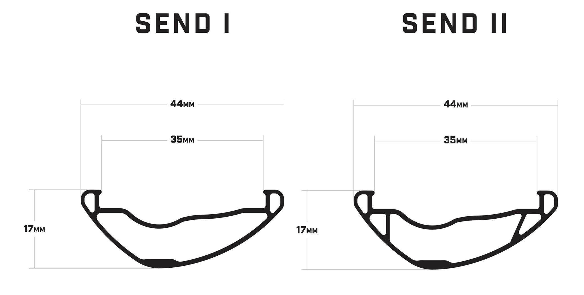 To eliminate pinch flats, we designed our bead walls with a hollow box-section profile to remove the sharp edges and create a broad contact point with the tire. This box-section results in a stronger bead wall that doesn’t slice tire sidewalls and it doesn’t add any additional weight. Our unique bead wall is used on both the Send 1 and Send 2 rims, but our Send 2 gets a little something extra.