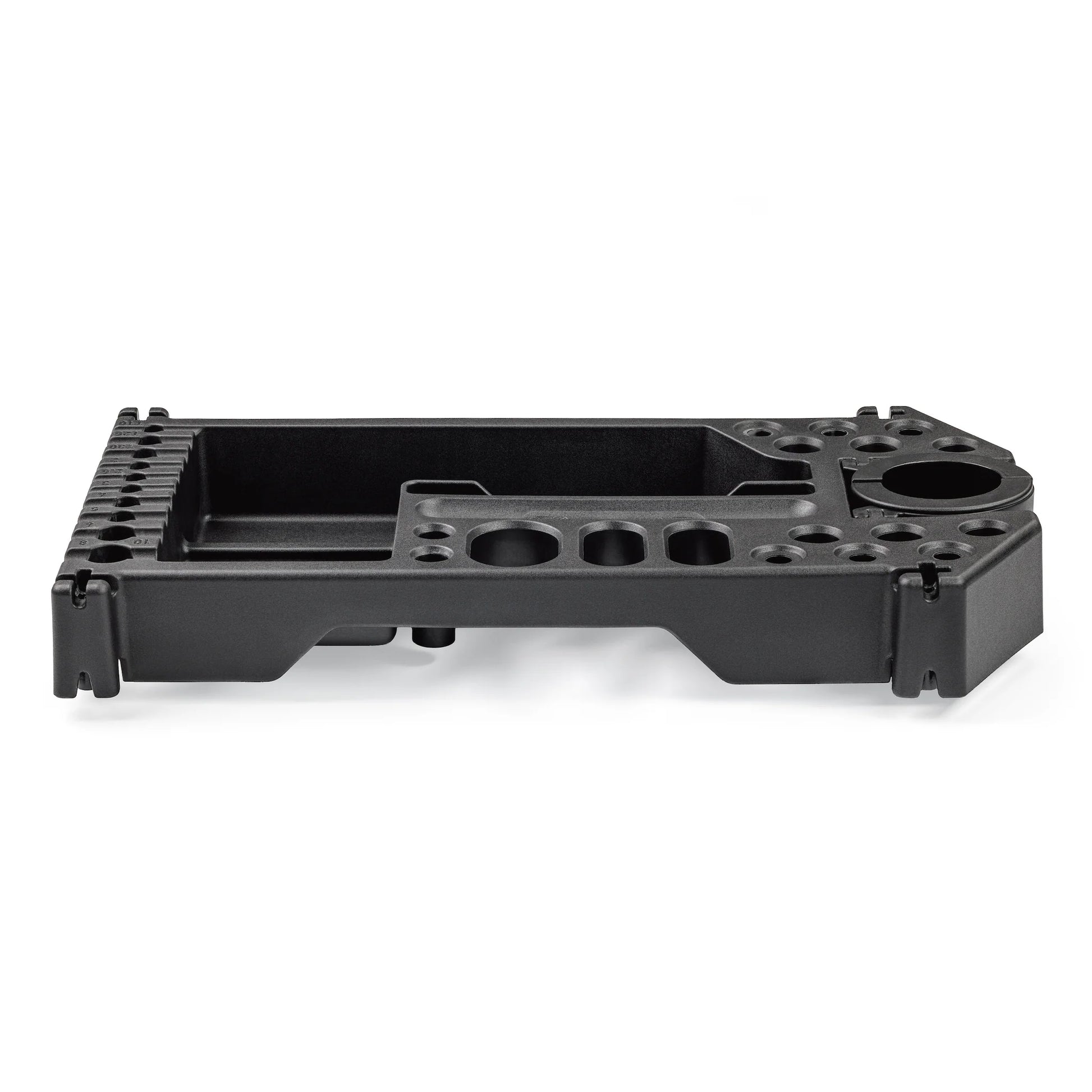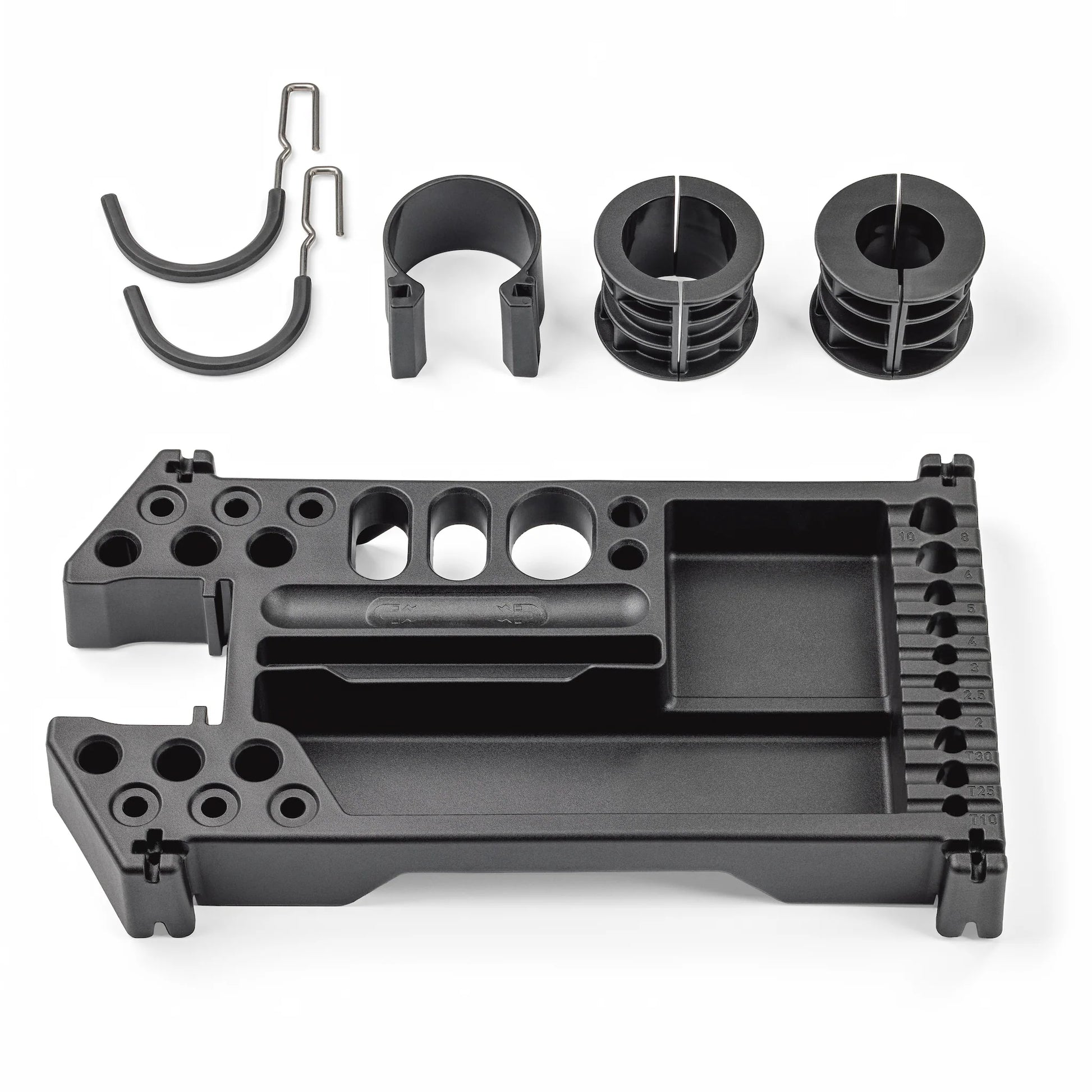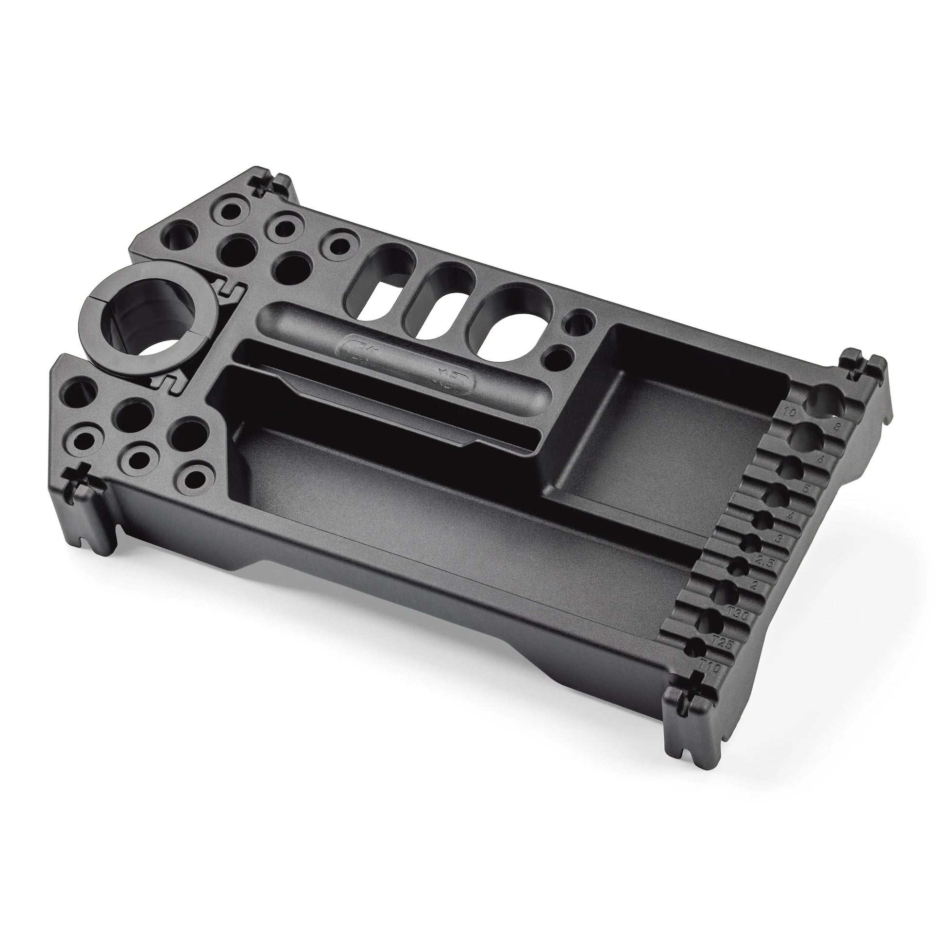 27 tool slots with spaces sized for T-Handle Hex and Torx Sets, 12 & 15mm thru axles plus a variety of large and small-handled tools. - 2 deep recessed, open bays for fluid bottles, irregularly shaped tools, bicycle parts, and more.