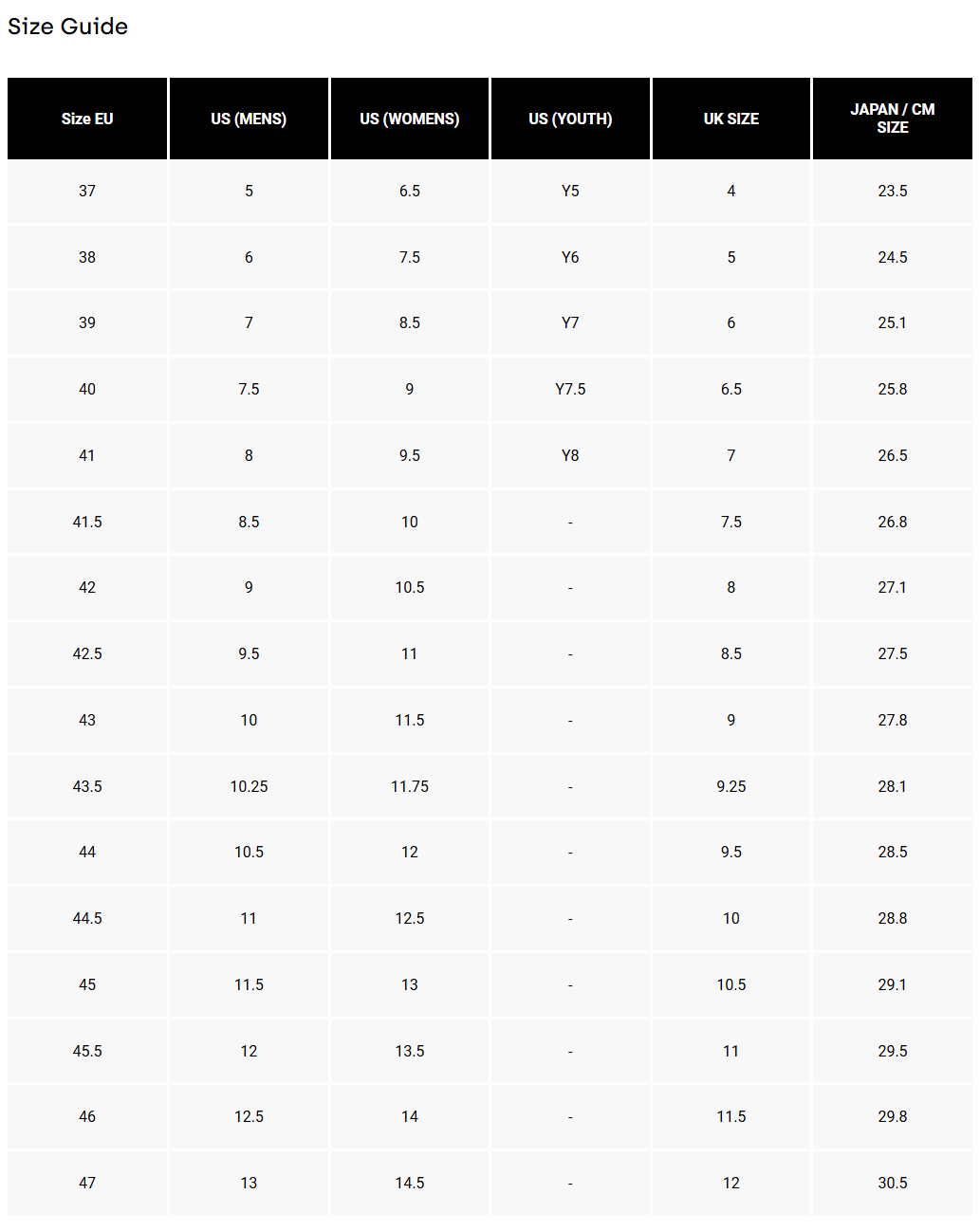 Sizing matches across all Fox Union shoe models (BOA®, Union, Union Flat, Union Canvas)