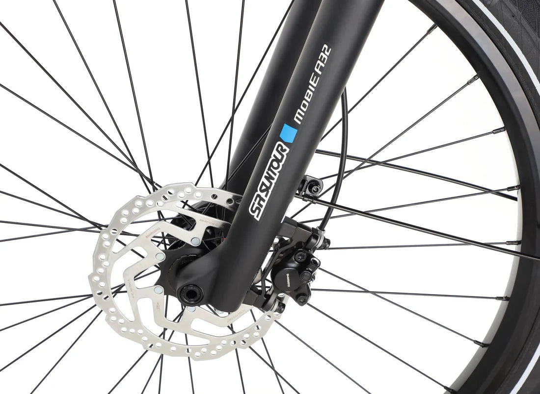 | Fork | SR Suntour Mobie A32 Coil DS; tapered steerer tube, 110 × 15 mm thru axle |