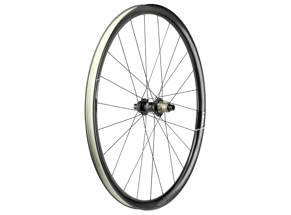 The Performance line ensures quality without compromising integrity. Emporia GC3 Performance Carbon wheels are sold individually, front and rear. This is the rear wheel, an 845 gram construction that draws on HED's deep carbon experience and handmade carbon lay-up expertise to create the 405 gram Emporia GC3 Performance Carbon Disc rim, giving it great strength, resiliency and ride quality. HED's engineers achieve this with precise placement lay-up150 GSM carbon (versus 110 GSM in the Pro) and creating an ideal structure to carry high and balanced spoke tension, which should reduce the need for frequent tension and truing despite attacking harsh gravel surfaces. The 30mm profile, disc-only tubeless ready rim features 26mm internal, 31mm external rim widths; with a hooked structure that allows you to run tubeless or clincher tires.