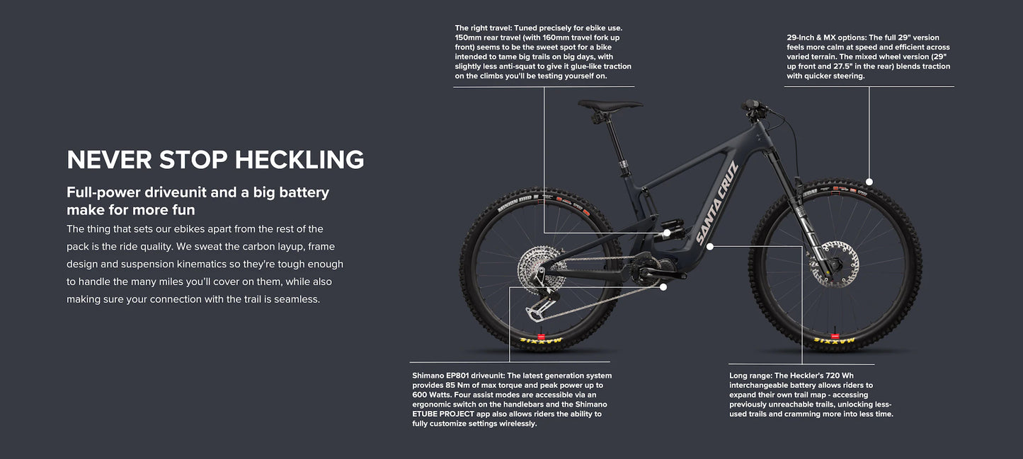 Danny MacAskill just doesn't stop talking about riding ebikes. And when he's riding he goes and goes and goes. Which is partly why we've made the Heckler go further, higher and faster. The Heckler has a huge interchangeable battery (720Wh), which allows riders to access previously unreachable trails, unlock less-used trails and cramming more into less time. The 150mm rear travel (with 160mm travel fork up front) of VPP™ suspension has been tuned to tame big trails on big descents and provide glue-like traction on the climbs. The Heckler has both mixed or dual 29-inch wheel size options and a full range of frame sizes from small to XXL.