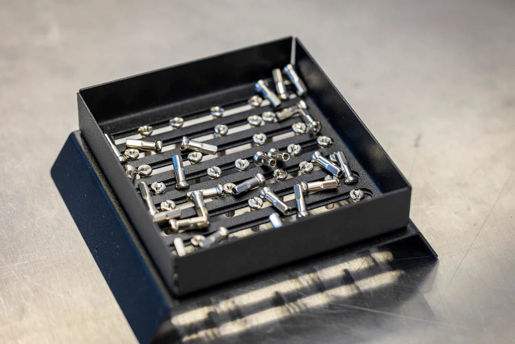 The Spoke Nipple Shuffler is the ultimate solution for streamlining the wheel build process. Simply dump your chosen spoke nipples into the shuffler, give it a gentle shake, and in no time the nipples will be organised and ready for easy pickup.