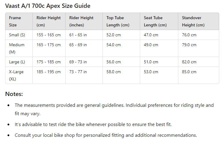 The VAAST A/1 700c Apex 1 Bike is built for adventure and exploration, seamlessly transitioning from leisurely rides to challenging gravel paths. With its thoughtful design and quality components, it promises to deliver an enjoyable and reliable riding experience on all your journeys. Whether you're tackling rugged trails or cruising through the city, this bike is engineered to perform and endure.