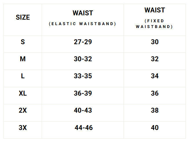 - Fixed waist with size adjusters *refer to size chart for proper sizing